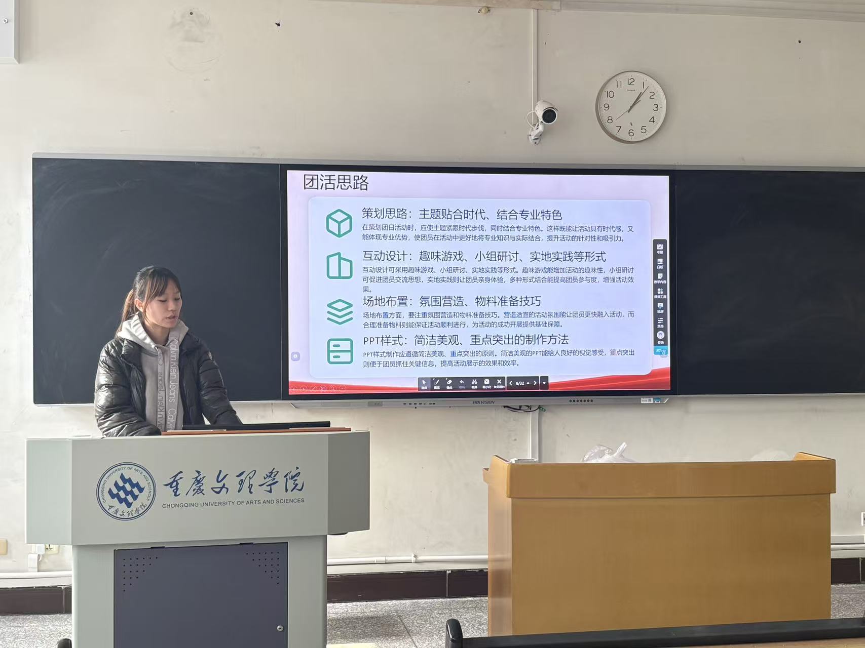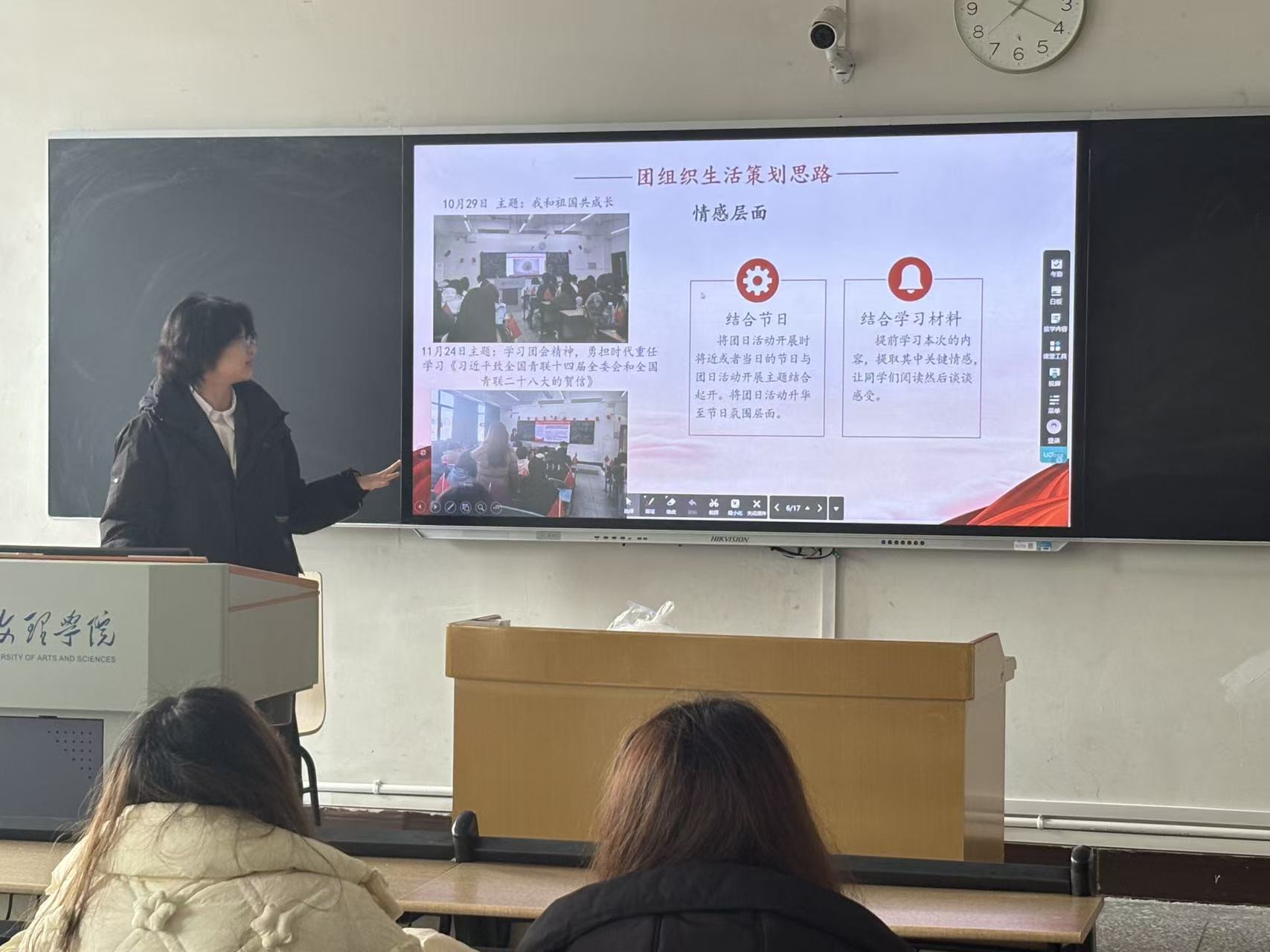 4f89340665f776a69857849f44c13c87.jpg   在优秀经验分享环节,学院优秀团支书代表刘娉婷、荣思嘉懿结合自身工作实践,带来了干货满满的经验分享。两位代表从团活主题策划的“破圈思路”、流程设计的“细节把控”、氛围营造的“互动技巧”、团员动员的“精准方法”等多个维度展开详细讲解,重点分享了如何结合文化传播、设计类专业特色,打造兼具思想性与趣味性的团活内容。例如将专业实践、志愿服务与团活主题深度融合,通过小组共创、成果展示等互动形式增强团员参与感,以及如何规范做好活动考勤、资料归档、效果反馈等日常工作。分享过程中,她们还通过案例展示、成果图片分享等方式,直观呈现了特色团活的开展成效,为在场学生骨干提供了可借鉴、可复制的实践样本,现场交流氛围热烈。